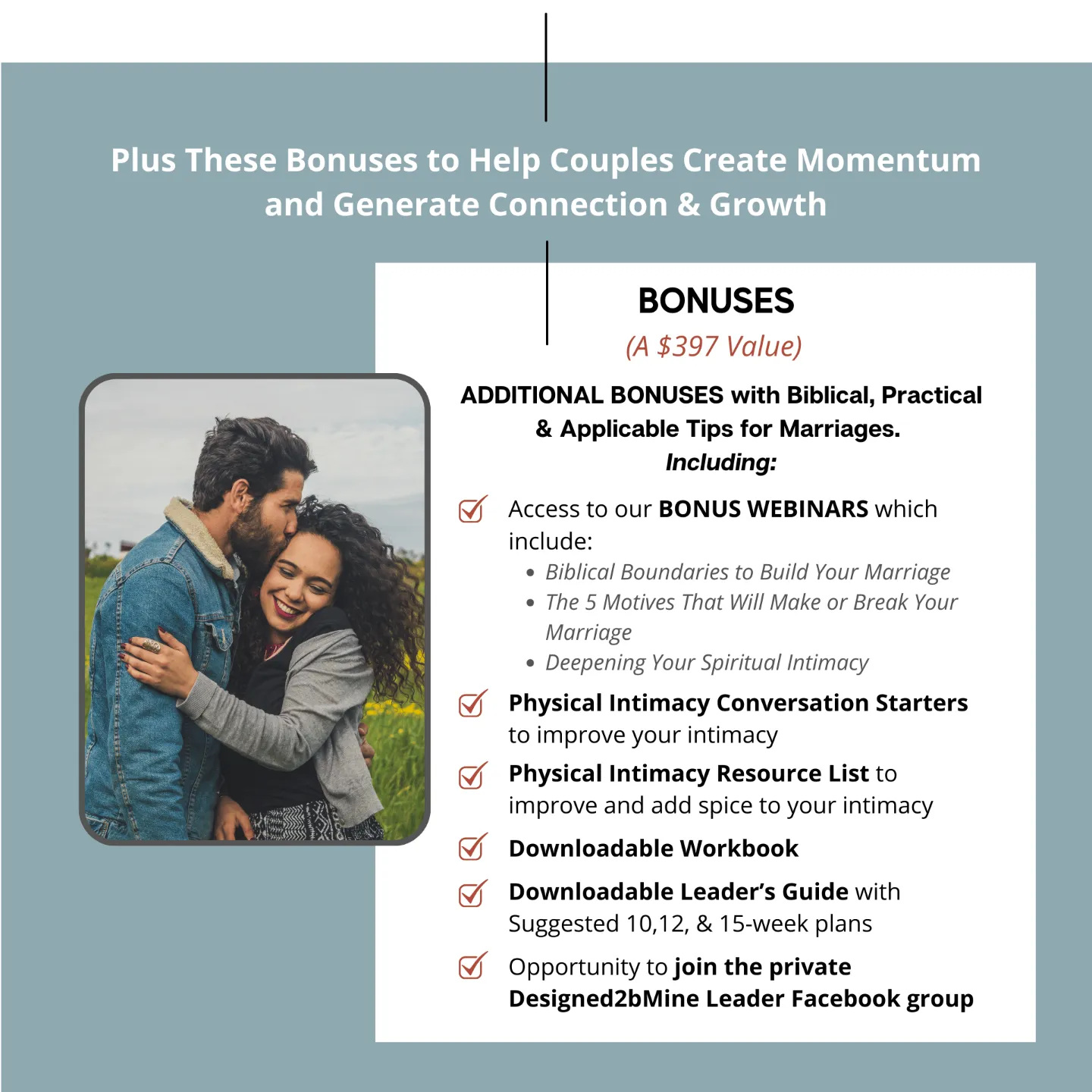 Designed2bMine for Small Groups is a Christ-centered Couples Connection Course helping spouses overcome obstacles, increase intimacy, and create meaningful moments.