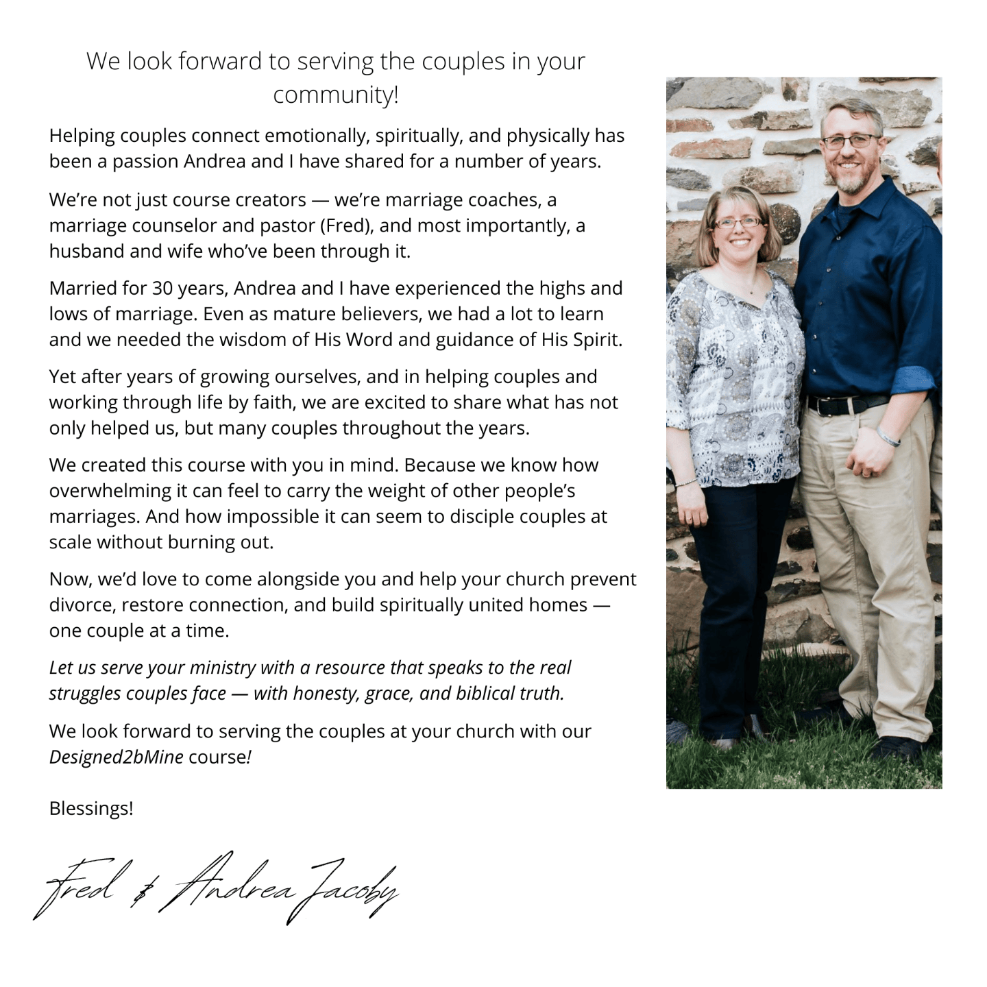 You're a Pastor or Ministry Leader who desires to help couples in your church grow in their relationships with God and one another. Your heart is for marriages and intact families, and you're looking for a resource that is Christ-centered, covers communication, conflict resolution, and helps couples grow in intimacy.